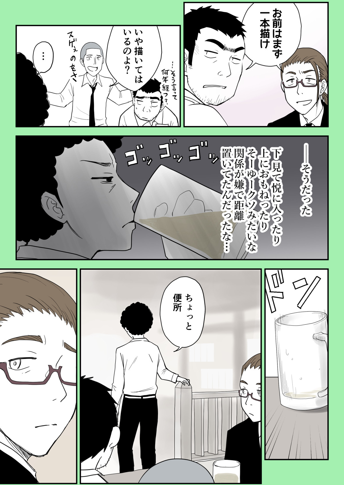 たられば(@tarareba72210代の頃の創作グループ(?)のひとりが亡くなった場面からスタート。グループからは亡くなった友人を含む数名がプロの漫画家になっており、主人公はいまだデビューできておらず、屈折を抱えているもようです。「仲間」という世間受けのよい言葉がテーマの作品で、いきなり酒場の支払いは誰が受け持つかという要素が入ってくるあたり、すでにキナ臭くてよいです。創作やお金が絡むと関係性が複雑になりますよね。複雑になりながら、複雑でもいいと思える集団を仲間と呼ぶのかなと、読みながら思いました。